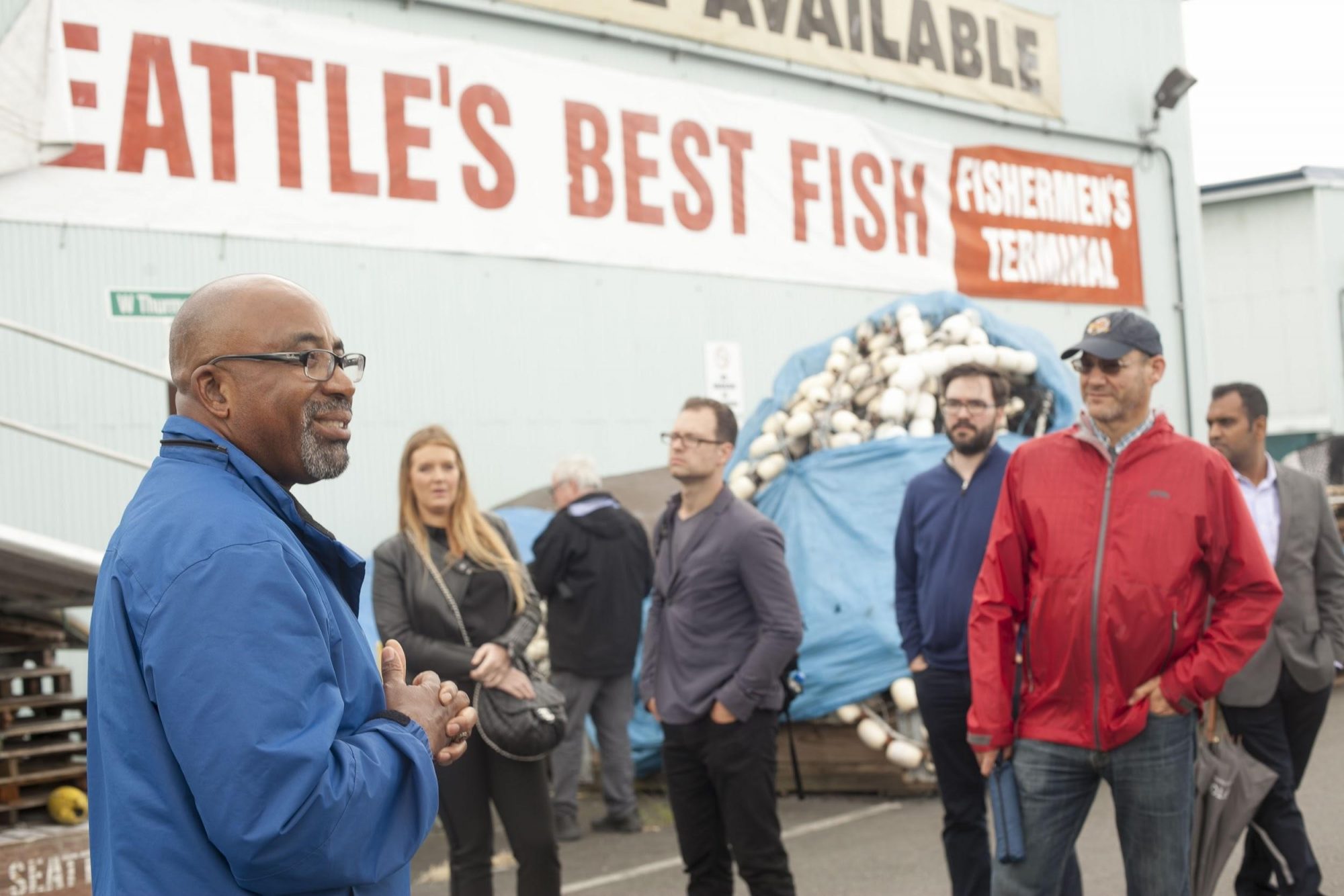 One of those places was the heart of Seattle’s commercial fishing operations at the Port of Seattle, where Allison’s tales of coastal squeeze displacing communities from historically working waterfronts rang true. With the commercial fleet up fishing in Alaska and a rainy summer sky looming overhead, the Port felt quiet and strangely empty. However, Port authorities Delmas Whittaker and Kelli Goodwin told the group it’s that perception of underutilized space that threatens to have development pressures overtake the Port’s critical maritime real estate. Without this critical maritime hub, getting seafood to the tables of Seattleites becomes evermore challenging and costly.