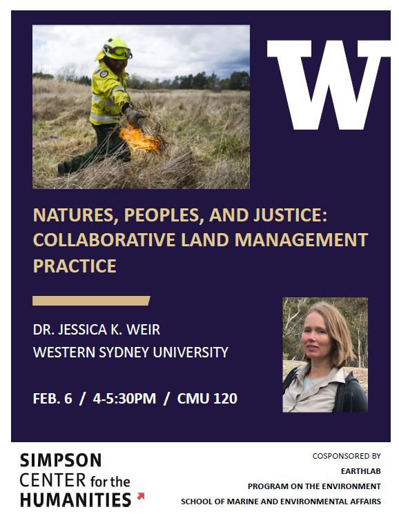 Please join the School of Marine and Environmental Affairs, the Program on the Environment, EarthLab, and the Simpson Center for the Humanities on Thursday, February 6 from 4:00-5:30 pm in Communications 120 as we welcome Jessica Weir, PhD from the Institute for Culture and Society, Western Sydney University.