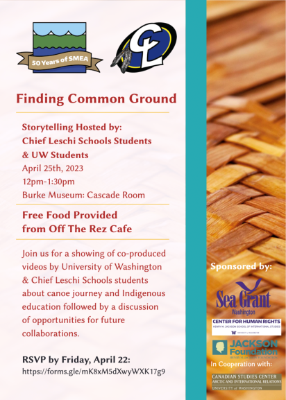 Please join us Tuesday, April 25th, 2023, from 12:00 to 1:30pm in the Burke Museum’s Cascade Room for Finding Common Ground: Digital Story Viewing. This is a collaborative event coproduced by University of Washington and Chief Leschi Schools students.