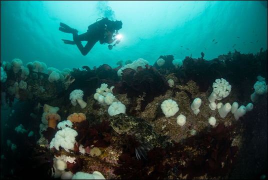 Edmonds Underwater Park is another thriving artificial reef ecosystem. Designated as a no-take zone since 1970 by the WDFW, this park consists of a 27-acre MPA with reefs composed of sunken boats and barges that are flourishing with vibrant marine life. The park itself has been stewarded by Bruce Higgins and a group of fellow divers since 1991 who value safety, security, and maintenance for park visitors. The Bruce Higgins Underwater Trail system stretches for 2.5 miles and is essentially a guided underwater playground for divers. Park stewards maintain new developments, invasive species removal, and ecosystem surveys, as well as buoys and signage to host more than 25,000 scuba divers annually. Every level of the food web seems to be thriving in this protected and stewarded artificial reef habitat. Eelgrass beds surrounding the sunken boats and barges provide a nursery for juvenile fish and crabs. Giant plumose anemones are neighbors to mussels, barnacles, shrimp, and many other invertebrates. The reef habitat also attracts giant lingcod, which can be viewed at “cleaning stations”, lazily waiting with their mouths open for symbiotic fish and shrimp to clean the parasites and build-up from their gills.