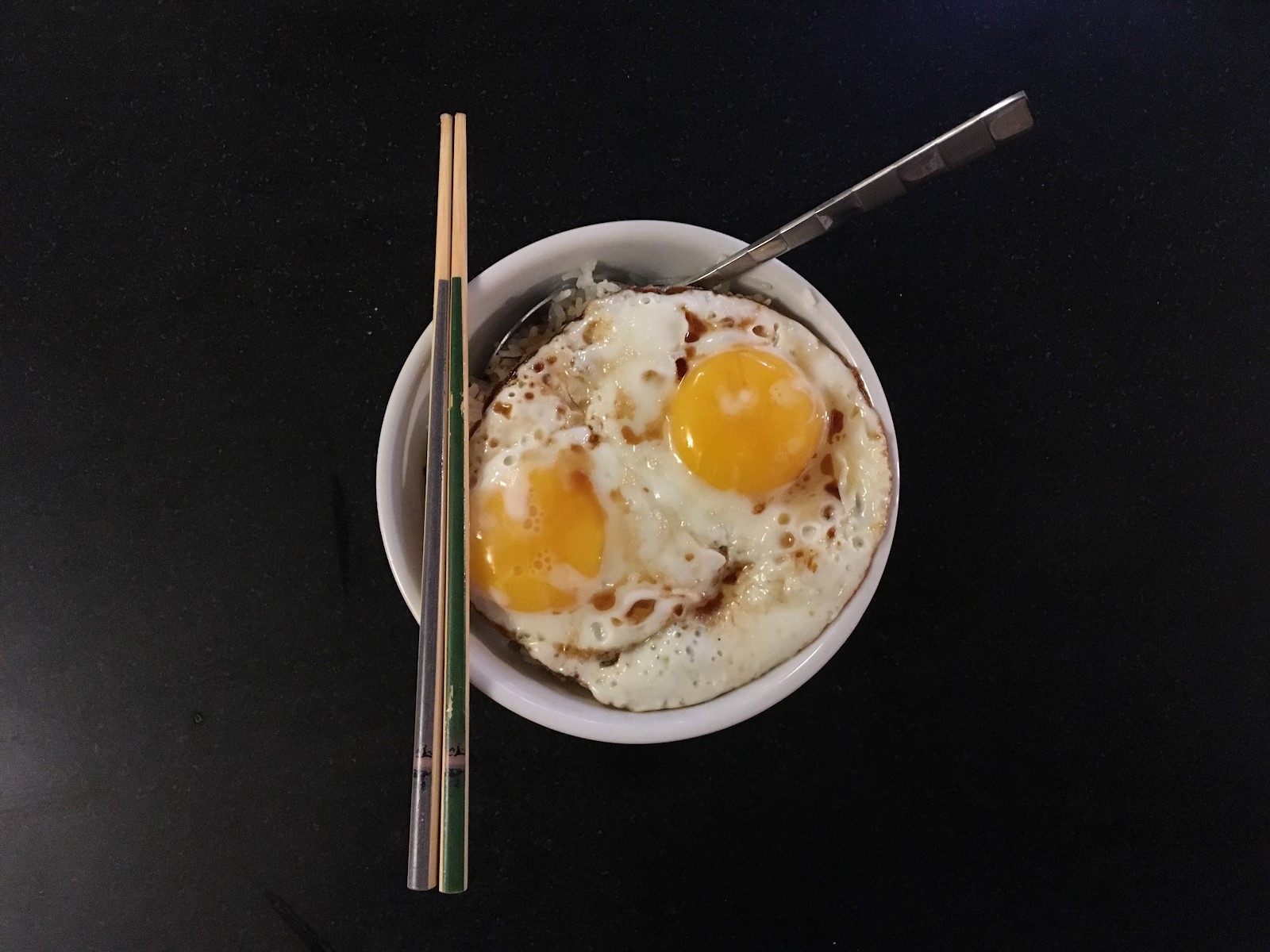 - When both the rice and eggs are done, serve them up in a bowl and add soy sauce and sesame oil to taste.