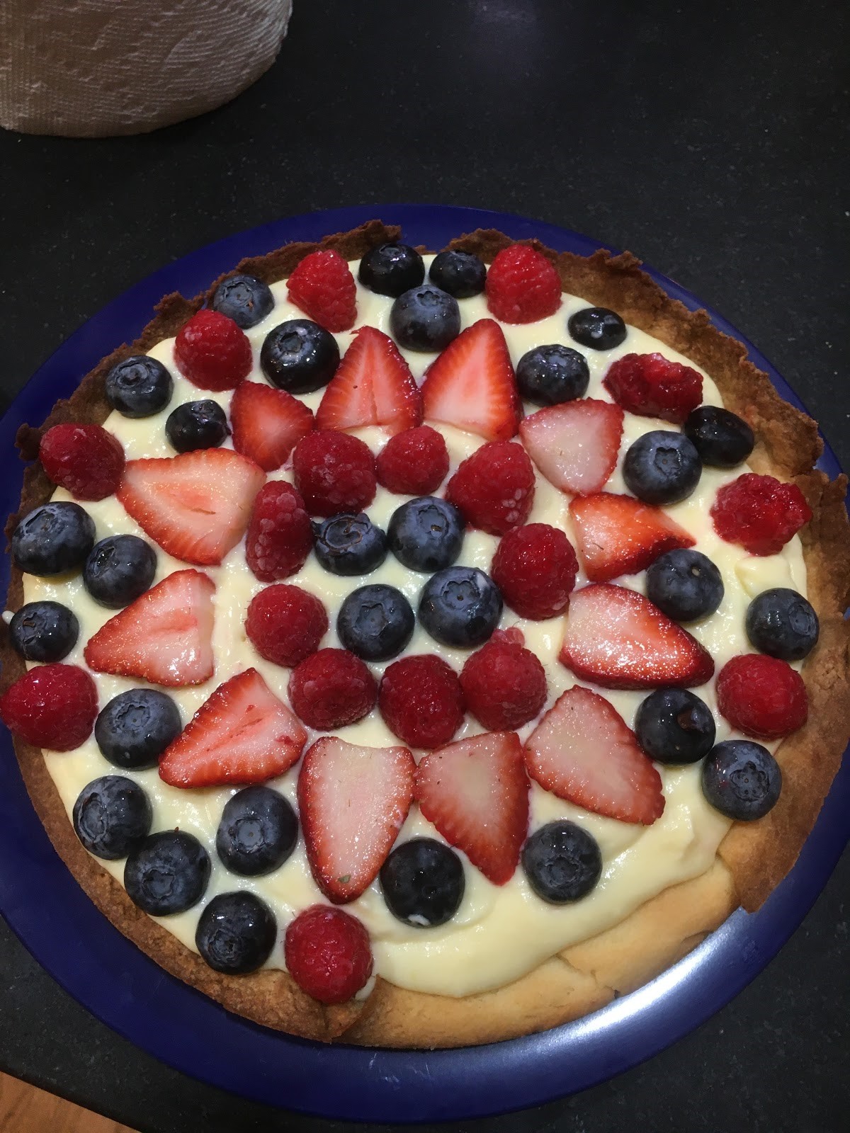 I have always had a sweet tooth which I got from my mom. One of the ways I de-stress is baking desserts for myself and loved ones. We had a bunch of berries in our fridge so I decided to make a fresh fruit tart with rich custard and a butter crust. It kind of fell apart but this isn’t The Great British Bake Off so all that matters is that it tasted amazing!