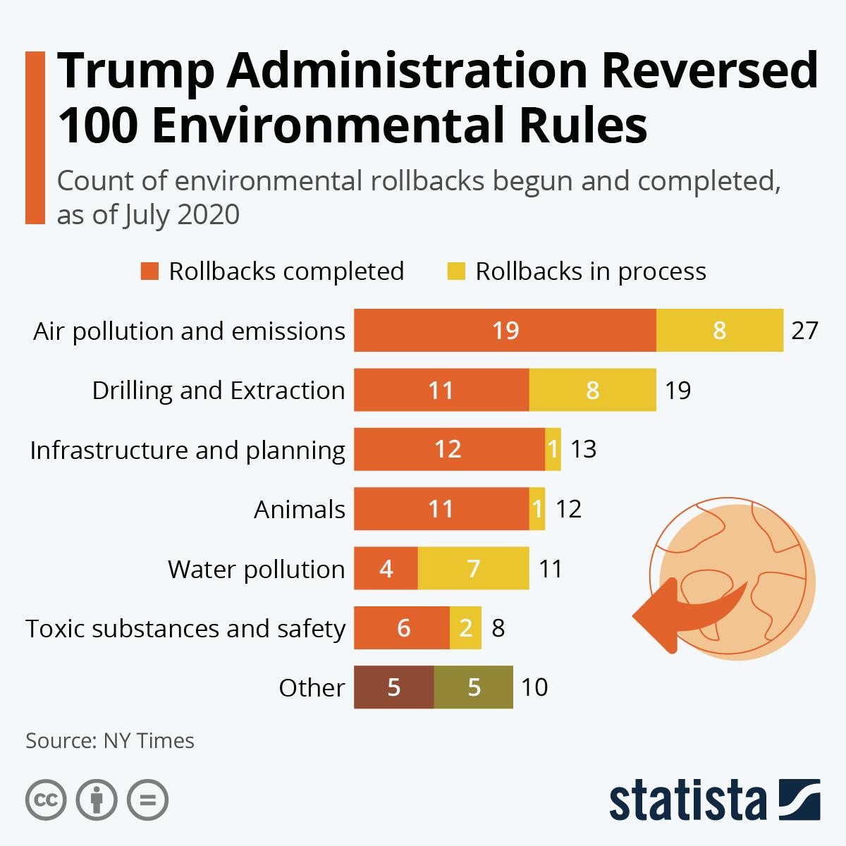 Trump’s administration focused on reducing regulations for energy, agriculture, land use and resource extraction. After fulfilling his intent to remove the U.S. from the 2015 Paris Agreement, the president targeted the EPA, rolling back regulations, reversing rules intended to reduce greenhouse gases, and dismissing global warming as legitimate.