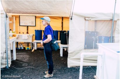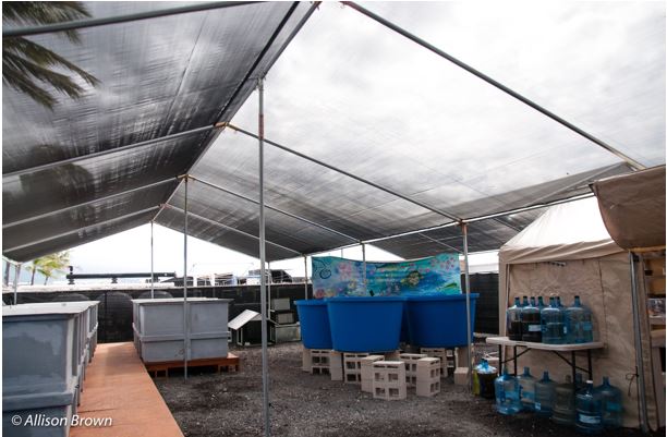 The Kanaloa Octopus Farm is located near the airport on black gravel, with carrier planes doing training runs overhead and a natural energy laboratory next door. A small, tarp-covered, chain link fence surrounds the shelter. Octopus-themed sundries are on sale and a green turf rug covers the gravel. The phone number on the sign is crossed out in black marker and a different one is handwritten below. This farm works to “provide a sustainable source of live cephalopods for aquariums, researchers and saltwater aquarium hobbyists” and is largely funded by the $25-per-person tours it offers every day. Delicate creatures, octopuses are not easy to grow or keep alive, and the people who work here are scientists with advanced degrees and a passion for the creatures.