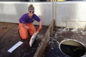 The QC gig kept us on our toes, despite the repetitive tasks. We spent most of our time squatting over large bins full of slimy, shiny, usually dead, salmon. In addition, we dodged the swinging 1000-pound brailer bags, called out weights, and ran around machinery and ice chests to shovel piles of fish into the holds below deck. Officially, we were responsible for checking each fishing boat’s delivery for specific quality standards, most notably fish temperature and acceptable bleeding practices. Fishermen received a higher price per pound for every quality standard that was met on an individual catch. Are your fish floating? Check. Did you use a mat or a slide to prevent bruising? Check. To ensure that fish are kept cold, many boats installed a refrigerated seawater system, which comes with the added challenge and cost of maintenance. Seafood companies also give a bonus for bleeding, which reduces bruising and improves the appearance and quality of the meat. Many boats hire an extra deckhand for part or all of the season in order to bleed as many fish as possible while continuing to pull in nets quickly. Working as QCs gave us a unique view into how the increasing consumer demand for whole fillets, as opposed to canned salmon, impacts vessel operations at sea. Even on seemingly endless nights, as we dashed from port to starboard clutching slimy thermometers and scribbling numbers on tiny squares of paper (#datacollection), it was hard not to appreciate life on the water. We felt lucky to be part of such a dynamic fishery!