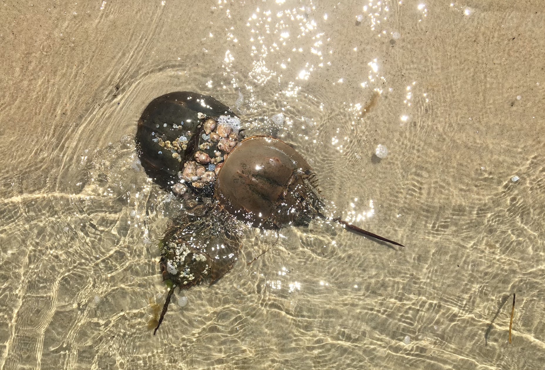 This past June, I spent a few days exploring those same beaches, where dunes rise up from the shore, topped with tufts of green beach grass that sway in the soft wind. The air there is salty and smells earthy, like soggy sediment and decaying reeds. While wading in the warm shallows of Harding’s Beach, I watched an Atlantic horseshoe crab (Limulus polyphemus) inch out of the depths, its spear-like tail leaving a delicate trail in the sand. Seemingly unbothered by my presence, he made his way toward a pile of male horseshoe crabs vying for their chance to mate with the sole female on the beach.